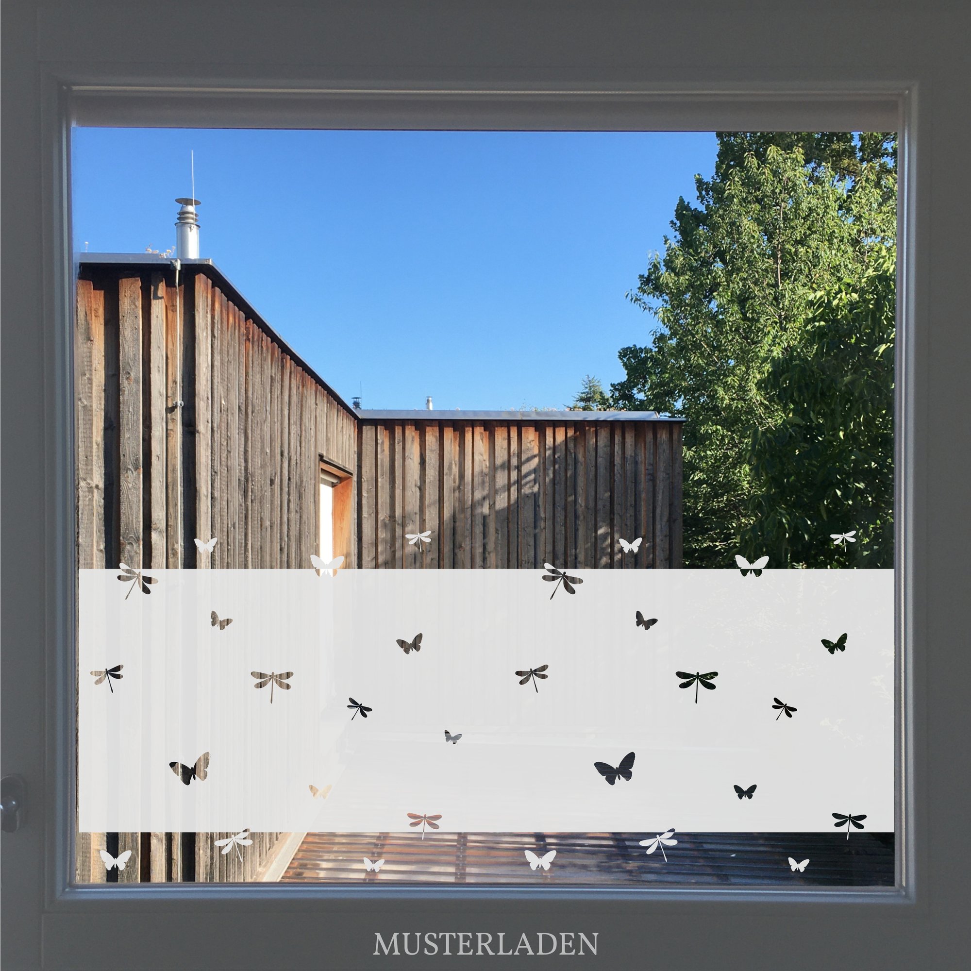 Lichtdurchlässige, blickdichte Fensterfolie mit Schmetterlingen und Libellen Motiv. Die Folie ist selbstklebend und kann sowohl im Innen- als auch im Außenbereich verwendet werden.